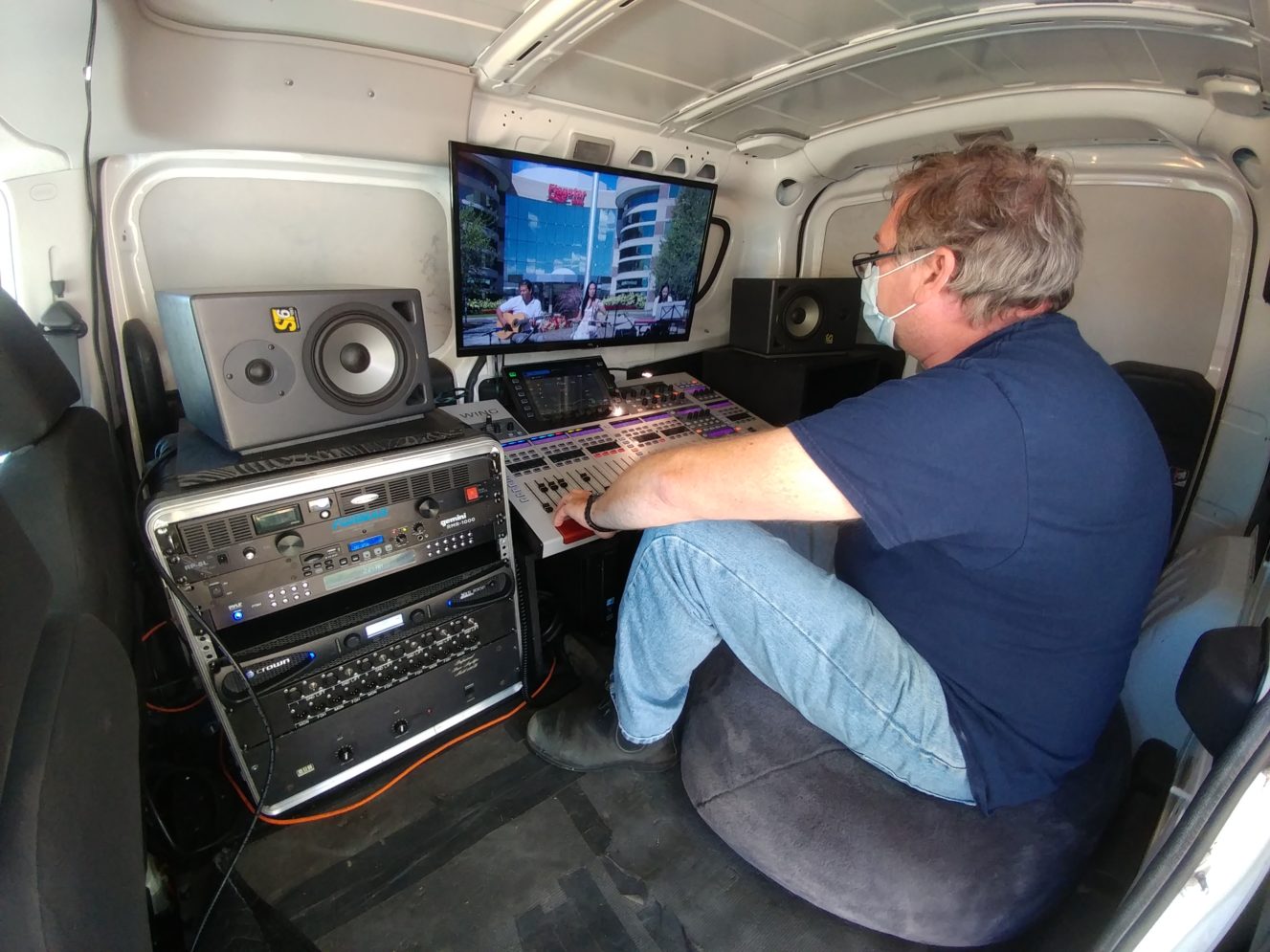 This performance was mixed, shot and streamed in real time with broadcast quality. Primary Equipment of this production where Behringer Wing for audio mixing, JVC HM-700 for main camera, and Black magic ATEM Mini Pro for switching and streaming.