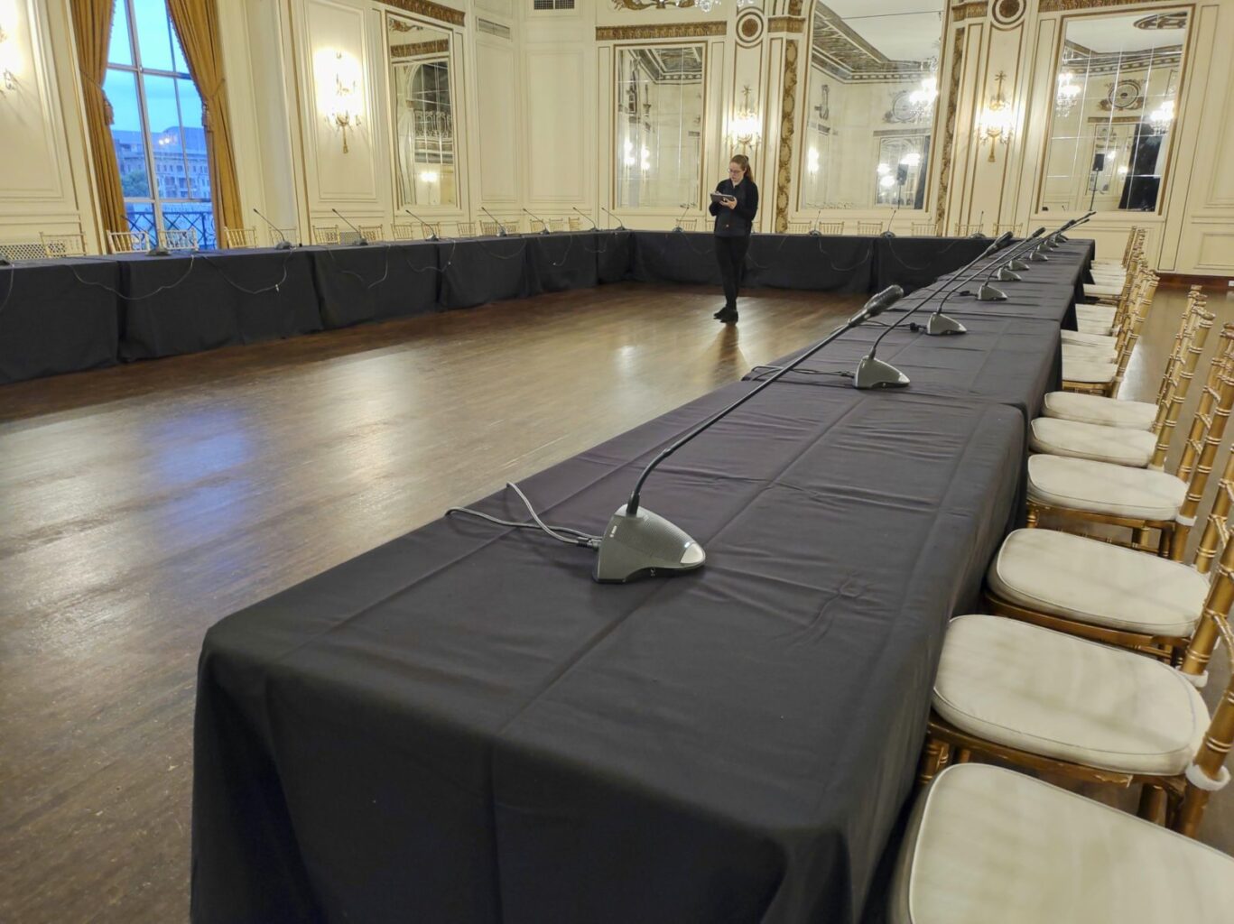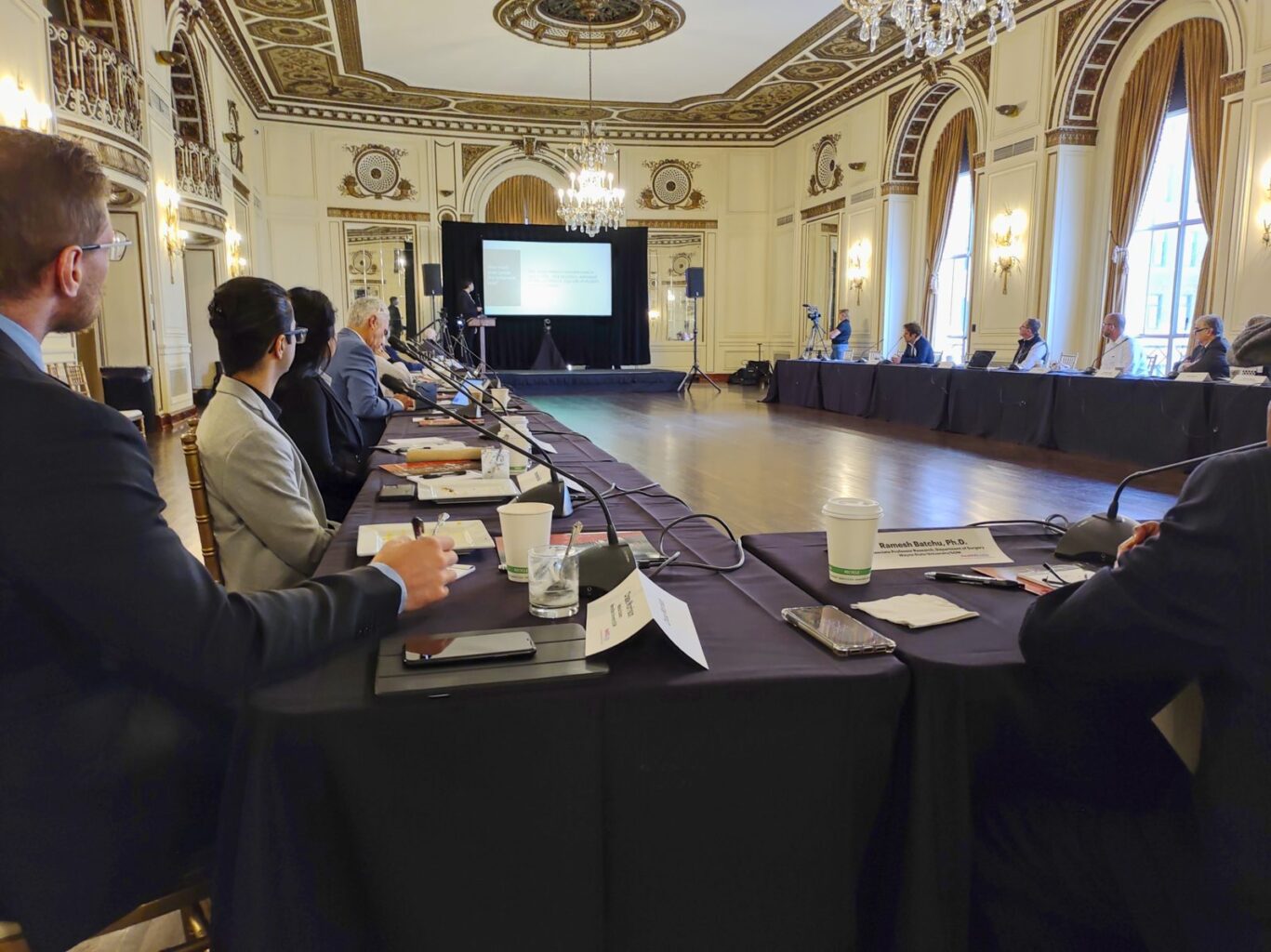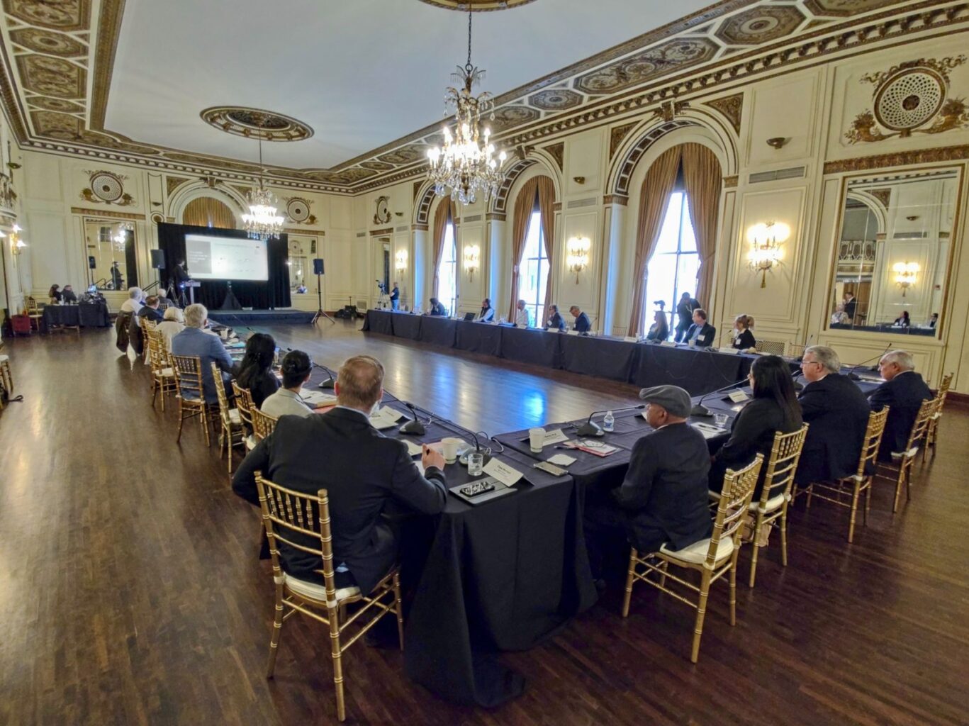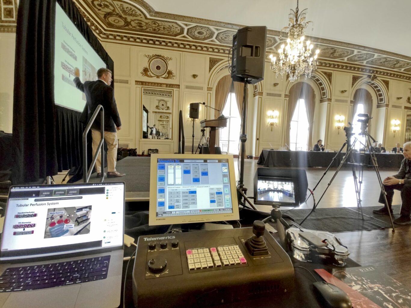 - Large video screens for presentations of local & remote presenters;